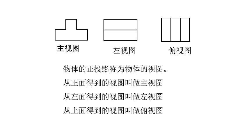物体的正投影称为物体的视图。从正面得到的视图叫做主视图从左面得到的视图叫做左视图从上面得到的视图叫做俯视图