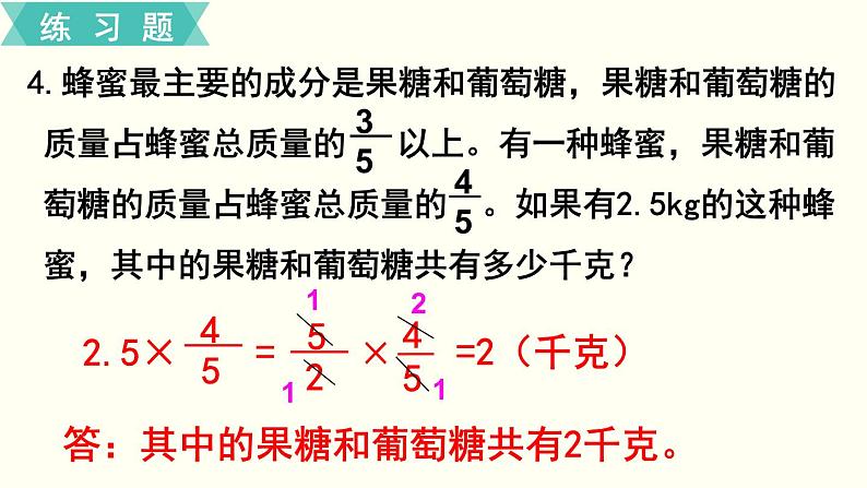 4.蜂蜜最主要的成分是果糖和葡萄糖,果糖和葡萄糖的质量占蜂蜜总质量的 以上。有一种蜂蜜,果糖和葡萄糖的质量占蜂蜜总质量的 。如果有2.5kg的这种蜂蜜,其中的果糖和葡萄糖共有多少千克?