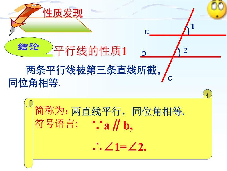 这是一份初中数学北师大版七年级下册3 平行线的性质教案配套ppt课件,共31页。PPT课件主要包含了平行线的判定方法2,平行线的判定方法3,平行线的性质,相等∠1∠5,∠2∠6,∠3∠7,∠4∠8,∵a∥b,几何语言,平行线的性质1等内容,欢迎下载使用。