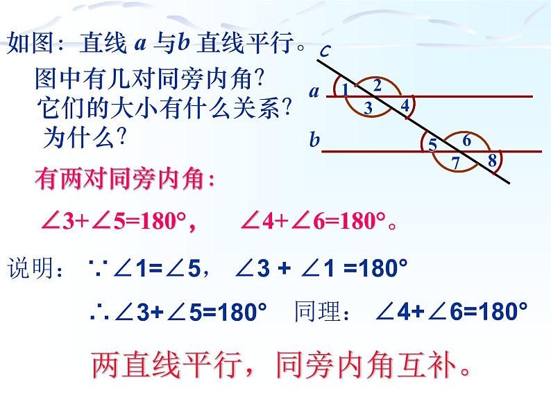 图中有几对同旁内角? 它们的大小有什么关系? 为什么?