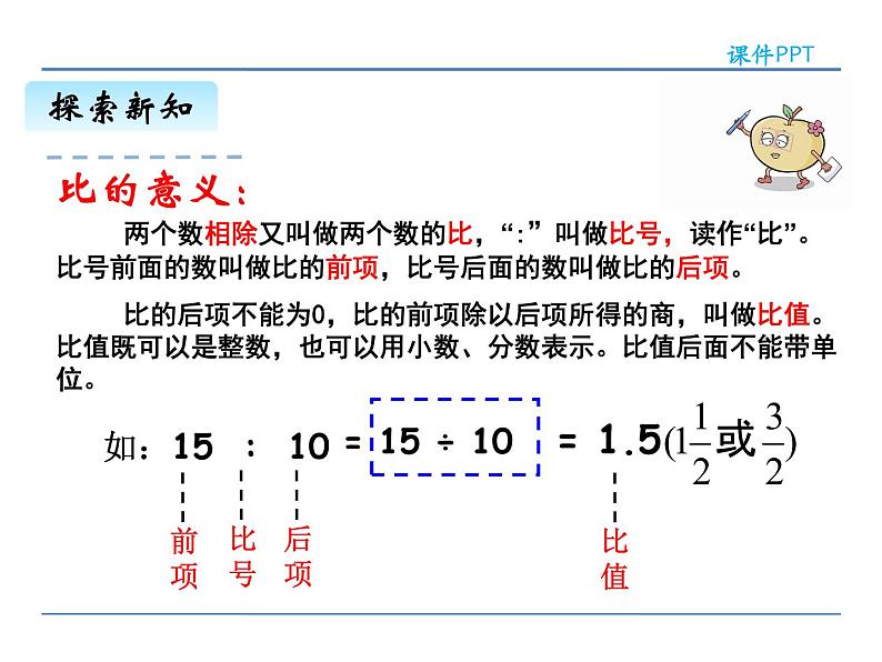 两个数相除又叫做两个数的比,“:”叫做比号,读作“比”。比号前面的数叫做比的前项,比号后面的数叫做比的后项。 比的后项不能为0,比的前项除以后项所得的商,叫做比值。比值既可以是整数,也可以用小数、分数表示。比值后面不能带单位。