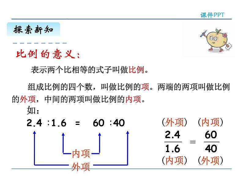 组成比例的四个数,叫做比例的项。两端的两项叫做比例的外项,中间的两项叫做比例的内项。