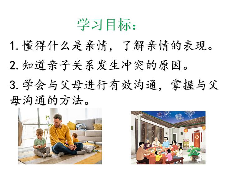 1.懂得什么是亲情,了解亲情的表现。2.知道亲子关系发生冲突的原因。 3.学会与父母进行有效沟通,掌握与父母沟通的方法。