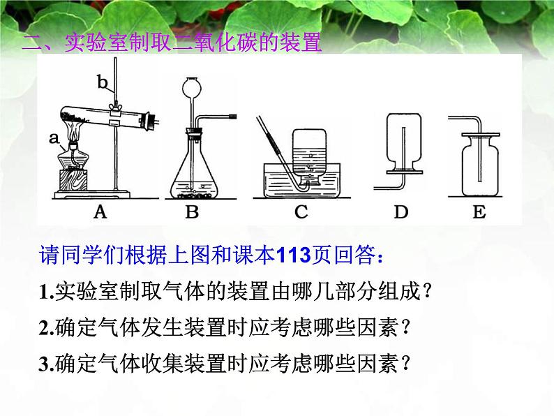 请同学们根据上图和课本113页回答:1.实验室制取气体的装置由哪几部分组成?2.确定气体发生装置时应考虑哪些因素?3.确定气体收集装置时应考虑哪些因素?