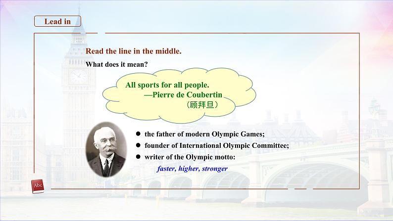 the father of modern Olympic Games;founder of International Olympic Committee;writer of the Olympic motto: faster, higher, stronger