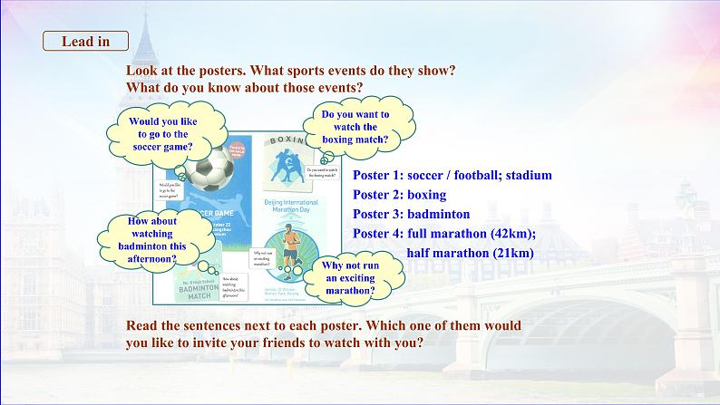 Poster 1: soccer / football; stadiumPoster 2: boxingPoster 3: badmintonPoster 4: full marathon (42km); half marathon (21km)