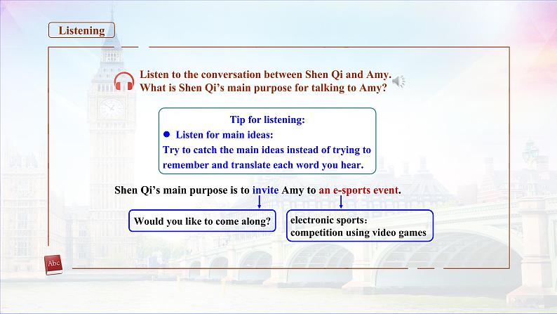 Tip for listening:Listen for main ideas:Try to catch the main ideas instead of trying to remember and translate each word you hear.