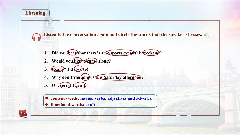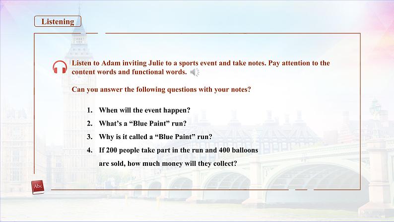 Listen to Adam inviting Julie to a sports event and take notes. Pay attention to the content words and functional words.