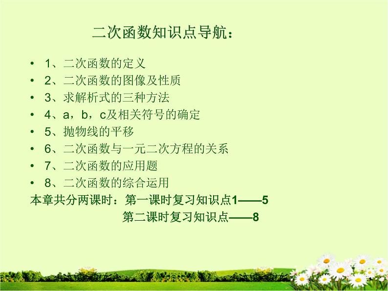 1、二次函数的定义2、二次函数的图像及性质3、求解析式的三种方法4、a,b,c及相关符号的确定5、抛物线的平移6、二次函数与一元二次方程的关系7、二次函数的应用题8、二次函数的综合运用本章共分两课时:第一课时复习知识点1——5 第二课时复习知识点——8