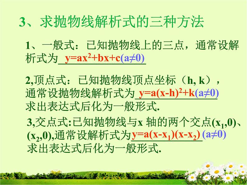 2,顶点式:已知抛物线顶点坐标(h, k),通常设抛物线解析式为_______________求出表达式后化为一般形式.