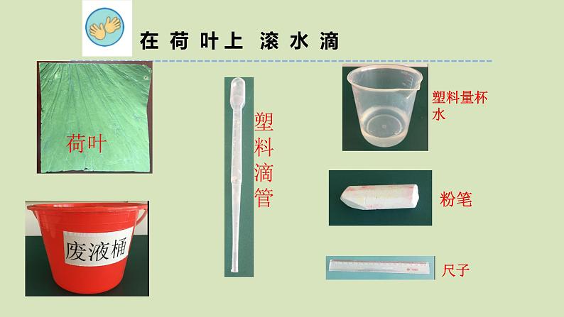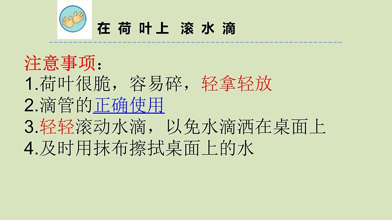 注意事项:1.荷叶很脆,容易碎,轻拿轻放2.滴管的正确使用3.轻轻滚动水滴,以免水滴洒在桌面上4.及时用抹布擦拭桌面上的水