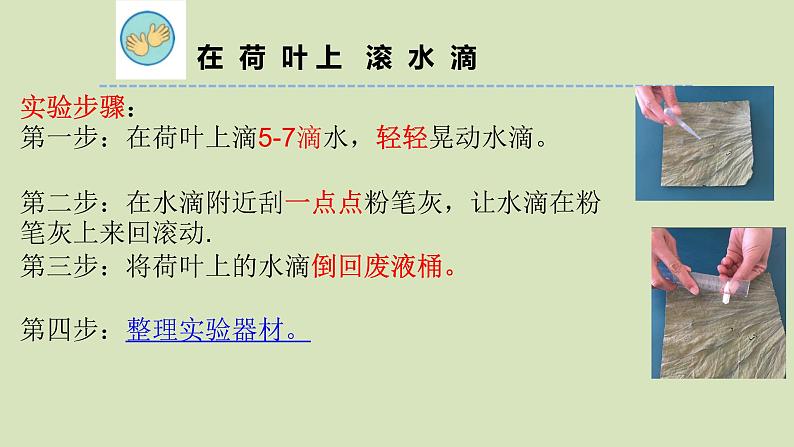 实验步骤:第一步:在荷叶上滴5-7滴水,轻轻晃动水滴。第二步:在水滴附近刮一点点粉笔灰,让水滴在粉笔灰上来回滚动.第三步:将荷叶上的水滴倒回废液桶。第四步:整理实验器材。