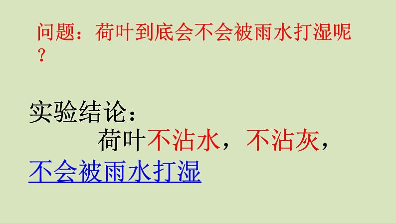 实验结论: 荷叶不沾水,不沾灰,不会被雨水打湿