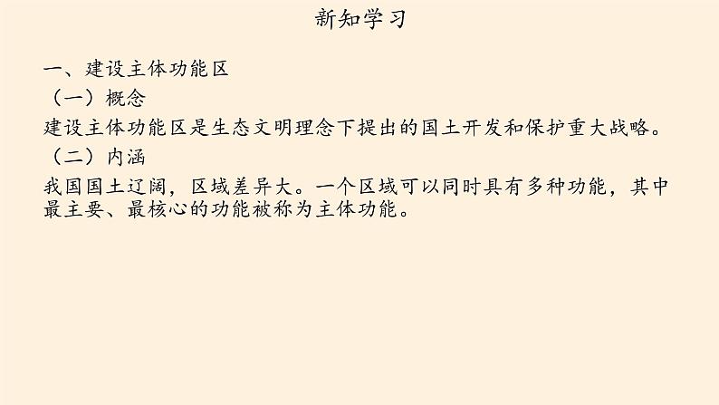 一、建设主体功能区(一)概念建设主体功能区是生态文明理念下提出的国土开发和保护重大战略。(二)内涵我国国土辽阔,区域差异大。一个区域可以同时具有多种功能,其中最主要、最核心的功能被称为主体功能。