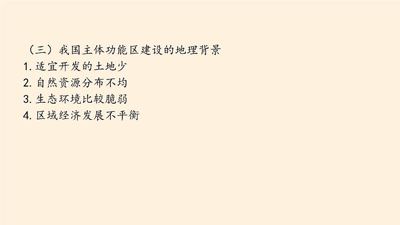 (三)我国主体功能区建设的地理背景1.适宜开发的土地少2.自然资源分布不均3.生态环境比较脆弱4.区域经济发展不平衡