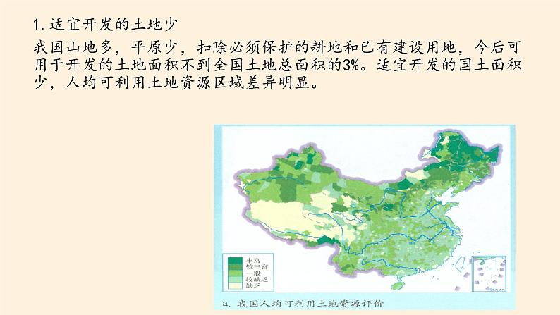 1.适宜开发的土地少我国山地多,平原少,扣除必须保护的耕地和已有建设用地,今后可用于开发的土地面积不到全国土地总面积的3%。适宜开发的国土面积少,人均可利用土地资源区域差异明显。