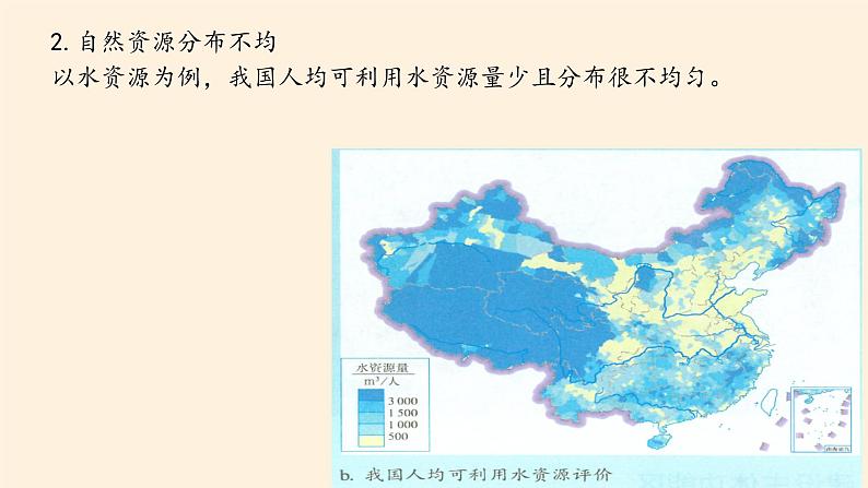 2.自然资源分布不均以水资源为例,我国人均可利用水资源量少且分布很不均匀。