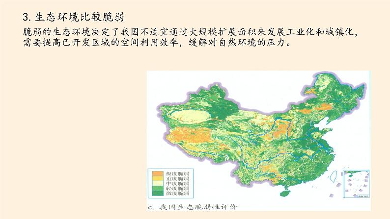 3.生态环境比较脆弱脆弱的生态环境决定了我国不适宜通过大规模扩展面积来发展工业化和城镇化,需要提高已开发区域的空间利用效率,缓解对自然环境的压力。