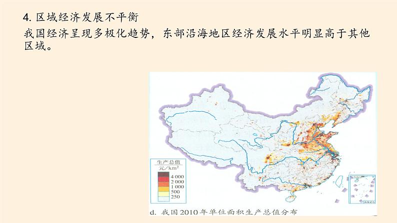 4.区域经济发展不平衡我国经济呈现多极化趋势,东部沿海地区经济发展水平明显高于其他区域。
