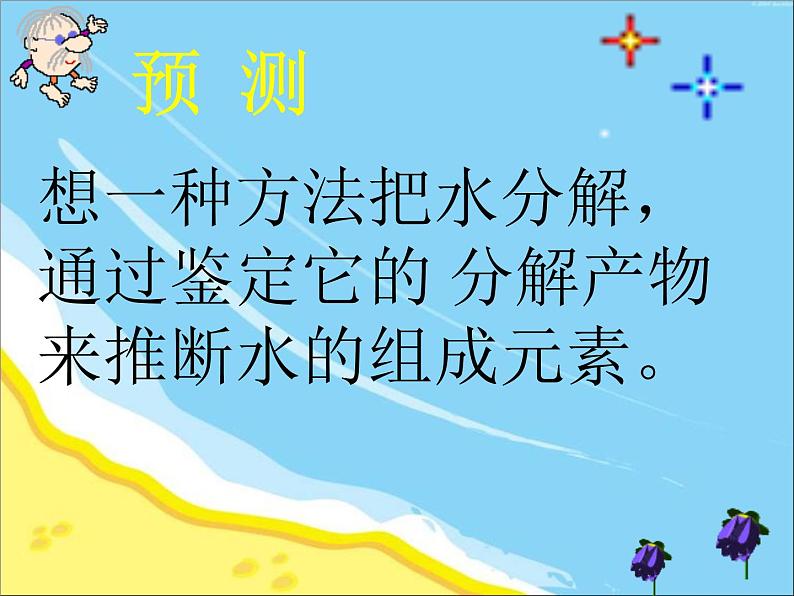 想一种方法把水分解,通过鉴定它的 分解产物来推断水的组成元素。