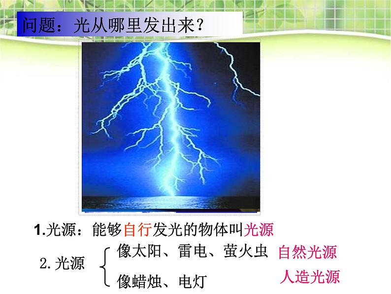 这是一份人教版八年级上册第四章 光现象第1节 光的直线传播教课课件ppt,共19页。PPT课件主要包含了自然光源,人造光源,不是光源,光是如何传播的,光的传播,描述光的传播,光线不是真是存在的,日全食,日偏食,日环食等内容,欢迎下载使用。