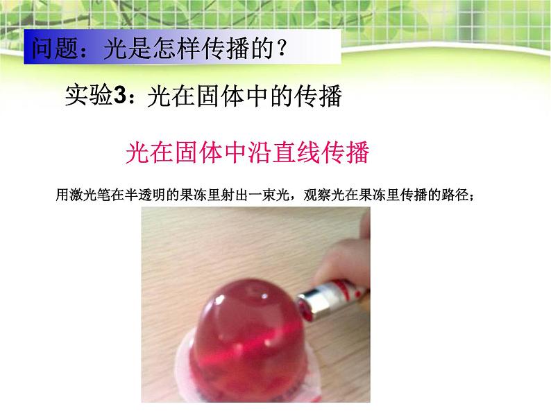 用激光笔在半透明的果冻里射出一束光,观察光在果冻里传播的路径;