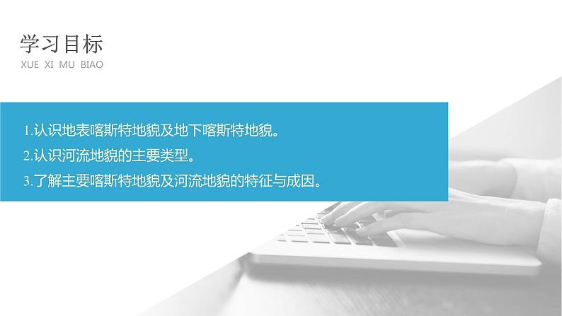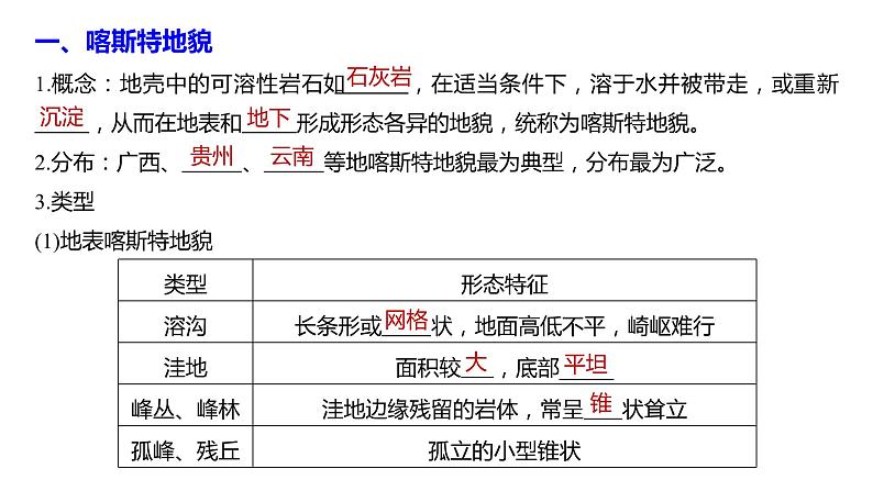 1.认识地表喀斯特地貌及地下喀斯特地貌。2.认识河流地貌的主要类型。3.了解主要喀斯特地貌及河流地貌的特征与成因。