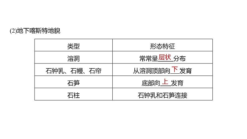 1.概念:地壳中的可溶性岩石如 ,在适当条件下,溶于水并被带走,或重新 ,从而在地表和 形成形态各异的地貌,统称为喀斯特地貌。2.分布:广西、 、 等地喀斯特地貌最为典型,分布最为广泛。3.类型(1)地表喀斯特地貌