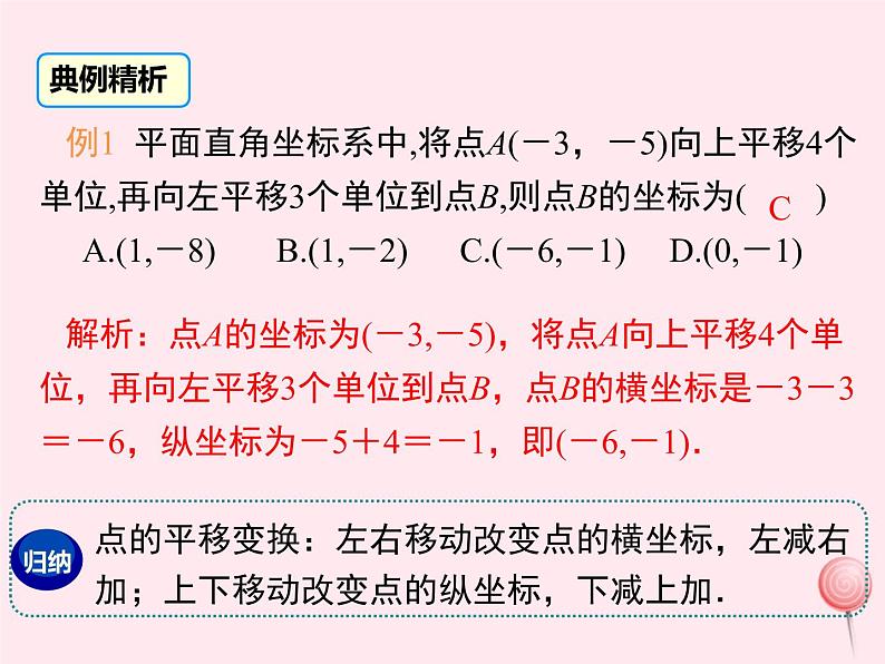 例1 平面直角坐标系中,将点A(-3,-5)向上平移4个单位,再向左平移3个单位到点B,则点B的坐标为( ) A.(1,-8) B.(1,-2) C.(-6,-1) D.(0,-1)
