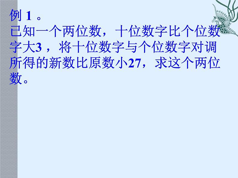 例 1 。 已知一个两位数,十位数字比个位数 字大3 ,将十位数字与个位数字对调 所得的新数比原数小27,求这个两位 数。
