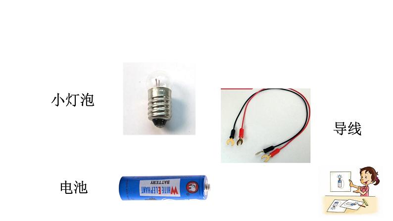 ●用电源、导线和小灯泡连接简单电路。 电流从电池的一端经导线流出,通过小灯泡,回到电池的另一端,形成一个完整的回路。