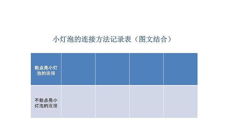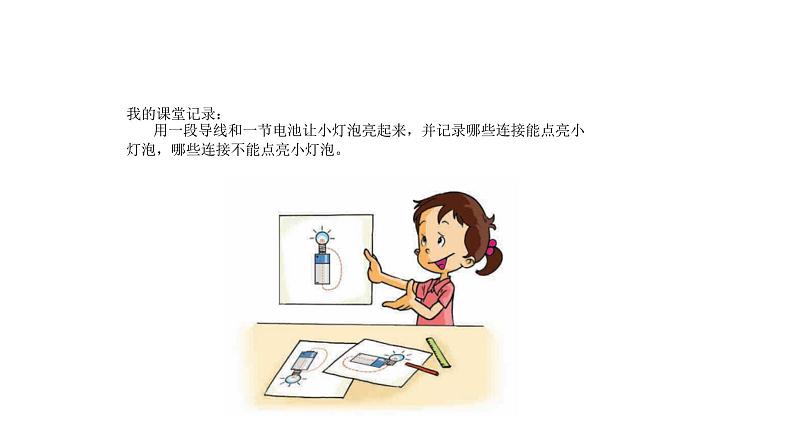 我的课堂记录: 用一段导线和一节电池让小灯泡亮起来,并记录哪些连接能点亮小灯泡,哪些连接不能点亮小灯泡。
