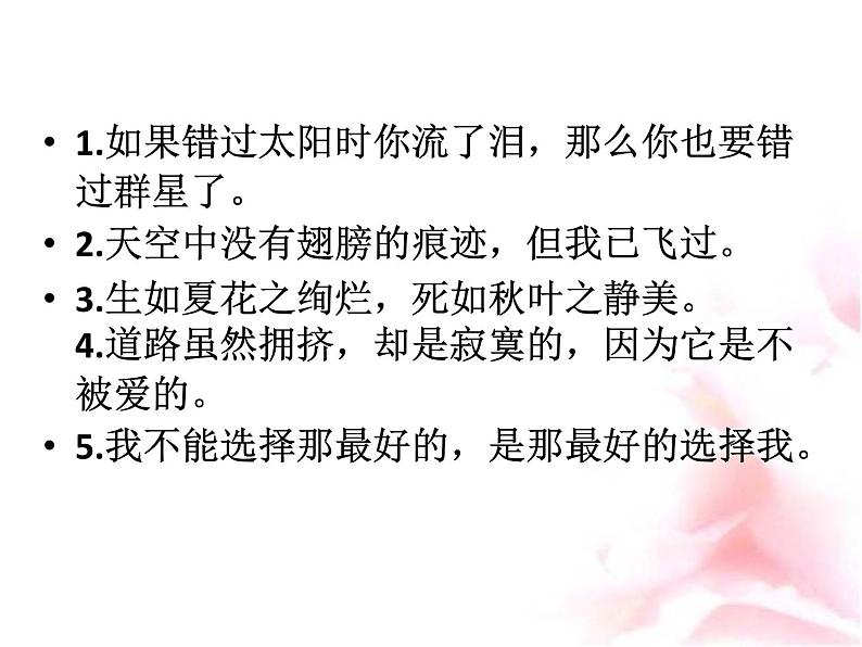 展开1.如果错过太阳时你流了泪,那么你也要错过群星了。2.天空中没有翅膀的痕迹,但我已飞过。3.生如夏花之绚烂,死如秋叶之静美。 4.道路虽然拥挤,却是寂寞的,因为它是不被爱的。5.我不能选择那最好的,是那最好的选择我。