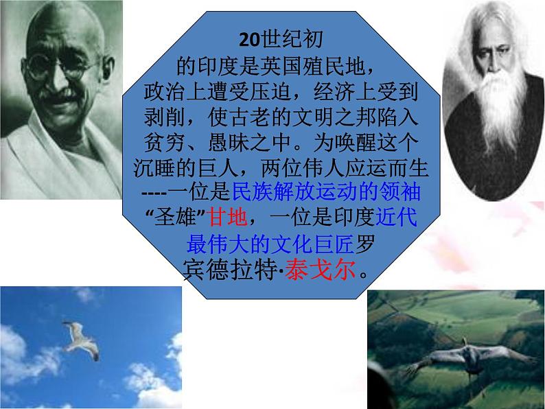 20世纪初的印度是英国殖民地,政治上遭受压迫,经济上受到剥削,使古老的文明之邦陷入贫穷、愚昧之中。为唤醒这个沉睡的巨人,两位伟人应运而生----一位是民族解放运动的领袖“圣雄”甘地,一位是印度近代最伟大的文化巨匠罗宾德拉特·泰戈尔。