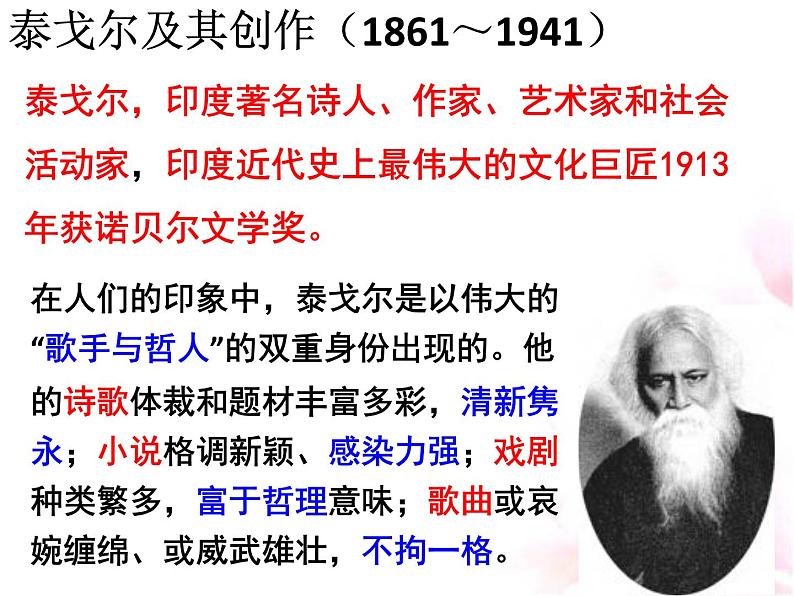 泰戈尔,印度著名诗人、作家、艺术家和社会活动家,印度近代史上最伟大的文化巨匠1913年获诺贝尔文学奖。
