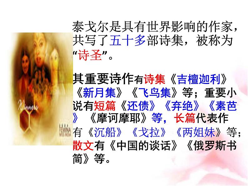 泰戈尔是具有世界影响的作家,共写了五十多部诗集,被称为“诗圣”。其重要诗作有诗集《吉檀迦利》《新月集》《飞鸟集》等;重要小说有短篇《还债》《弃绝》《素芭》 《摩诃摩耶》等,长篇代表作有《沉船》《戈拉》《两姐妹》等;散文有《中国的谈话》《俄罗斯书简》等。