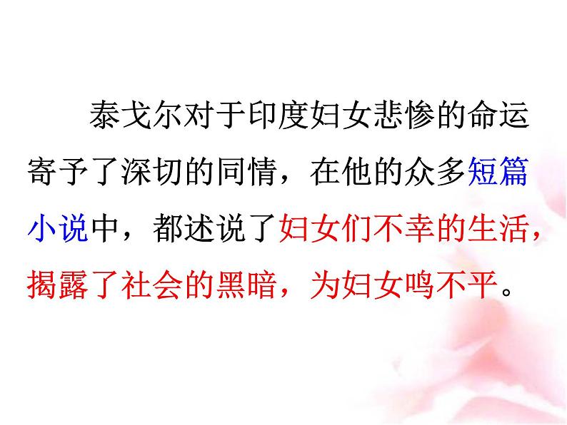 泰戈尔对于印度妇女悲惨的命运寄予了深切的同情,在他的众多短篇小说中,都述说了妇女们不幸的生活,揭露了社会的黑暗,为妇女鸣不平。