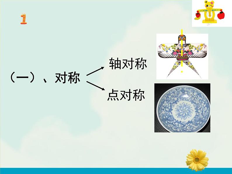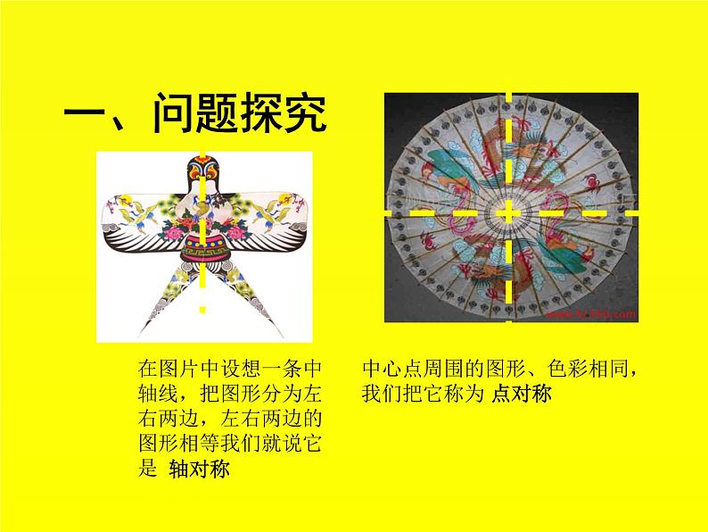 中心点周围的图形、色彩相同,我们把它称为 点对称