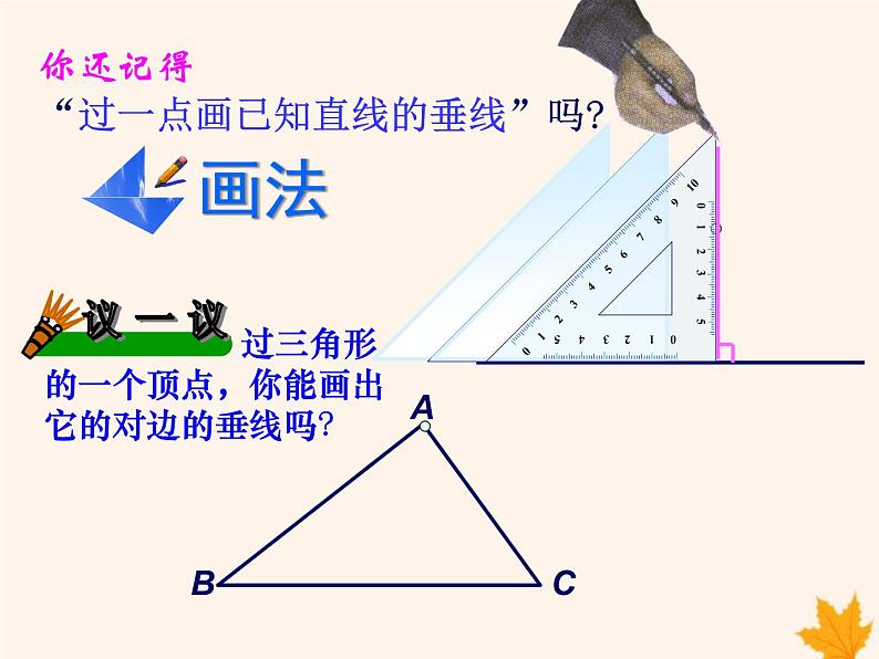 1.三角形的高线、中线、角平分线、重心等有关概念及它们的画法。