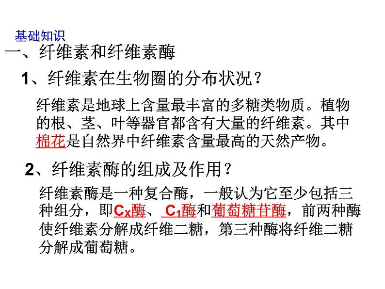 纤维素酶是一种复合酶,一般认为它至少包括三种组分,即CX酶、 C1酶和葡萄糖苷酶,前两种酶使纤维素分解成纤维二糖,第三种酶将纤维二糖分解成葡萄糖。