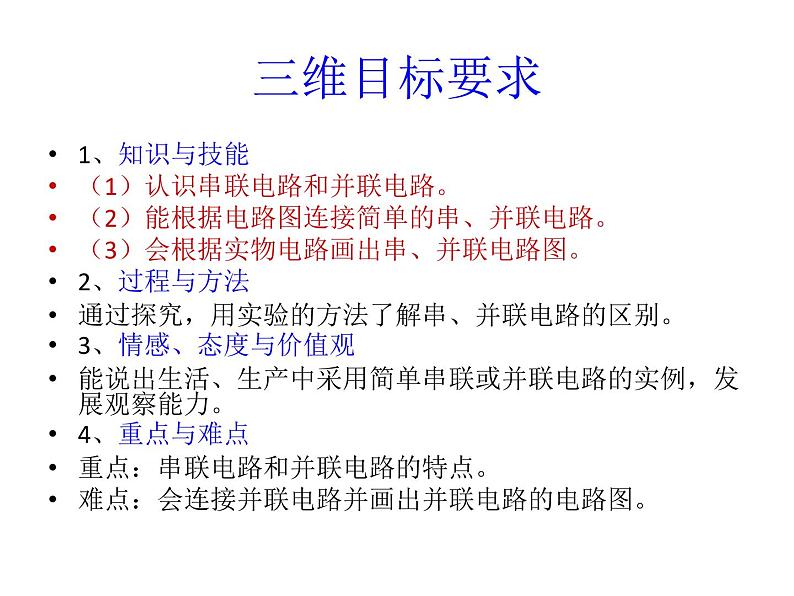 1、知识与技能(1)认识串联电路和并联电路。(2)能根据电路图连接简单的串、并联电路。(3)会根据实物电路画出串、并联电路图。2、过程与方法通过探究,用实验的方法了解串、并联电路的区别。3、情感、态度与价值观能说出生活、生产中采用简单串联或并联电路的实例,发展观察能力。4、重点与难点重点:串联电路和并联电路的特点。难点:会连接并联电路并画出并联电路的电路图。