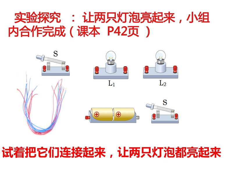 实验探究 : 让两只灯泡亮起来,小组内合作完成(课本 P42页 )