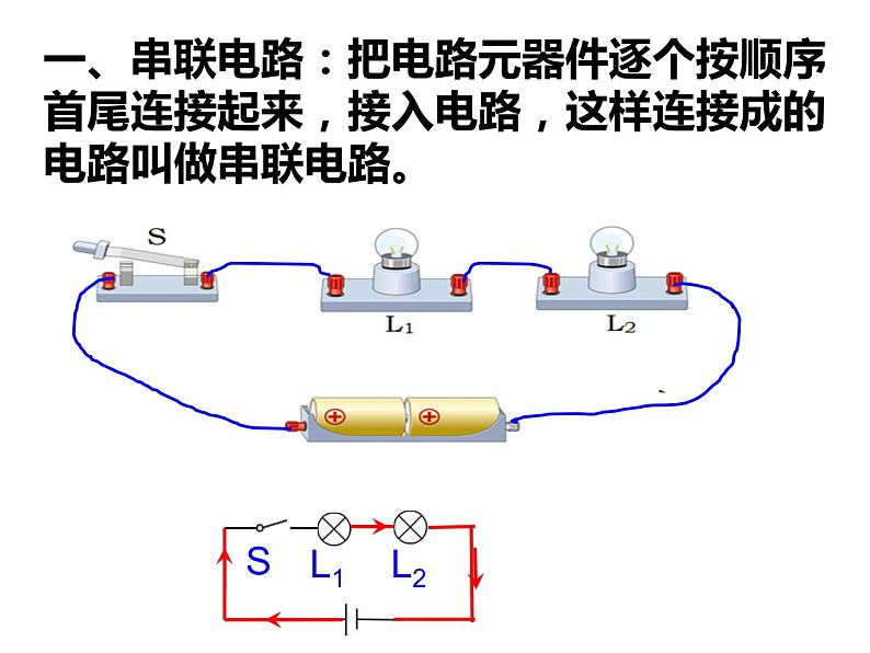 一、串联电路:把电路元器件逐个按顺序首尾连接起来,接入电路,这样连接成的电路叫做串联电路。