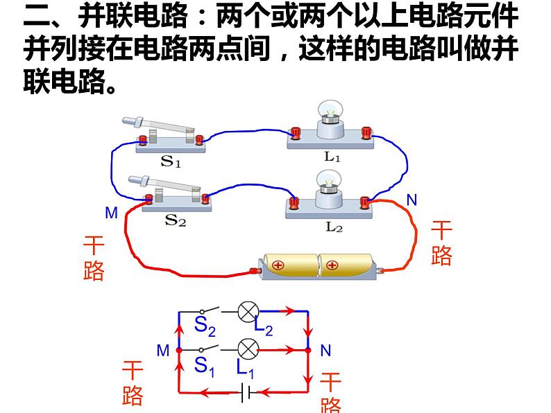 二、并联电路:两个或两个以上电路元件并列接在电路两点间,这样的电路叫做并联电路。