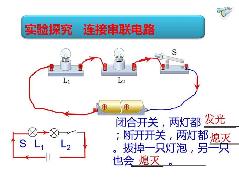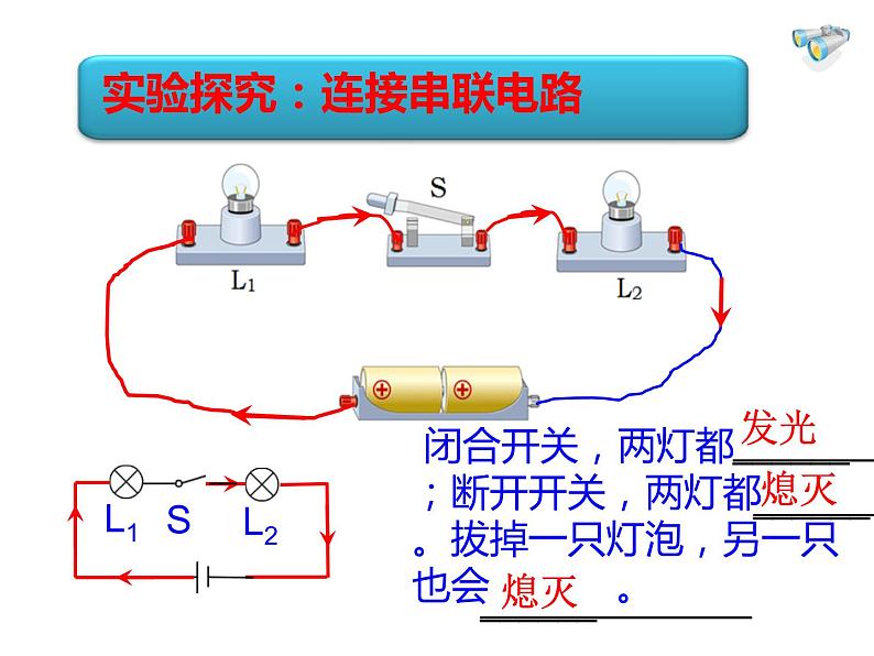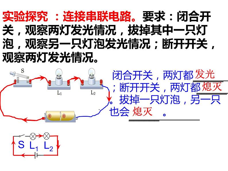 实验探究 :连接串联电路。要求:闭合开关,观察两灯发光情况,拔掉其中一只灯泡,观察另一只灯泡发光情况;断开开关,观察两灯发光情况。