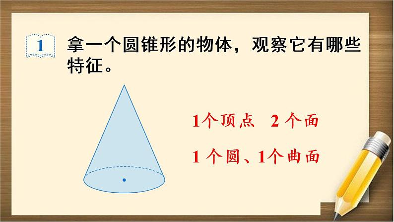 拿一个圆锥形的物体,观察它有哪些特征。