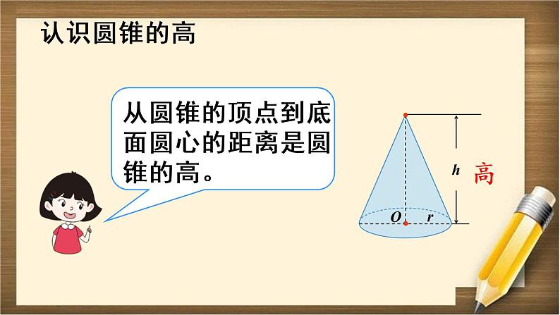 小学数学人教版六年级下册圆锥的认识教课课件ppt: 这是一份小学数学人教版六年级下册圆锥的认识教课课件ppt,共13页。PPT课件主要包含了圆锥的高只有一条,圆锥的侧面展开图,怎样测量圆锥的高等内容,欢迎下载使用。