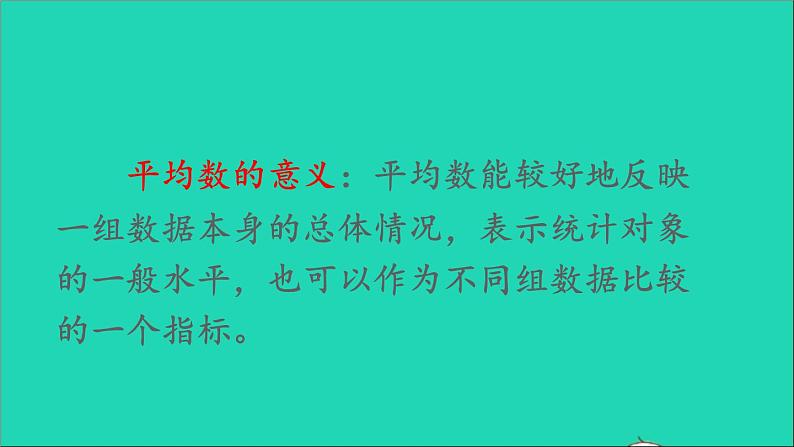 平均数的意义:平均数能较好地反映一组数据本身的总体情况,表示统计对象的一般水平,也可以作为不同组数据比较的一个指标。