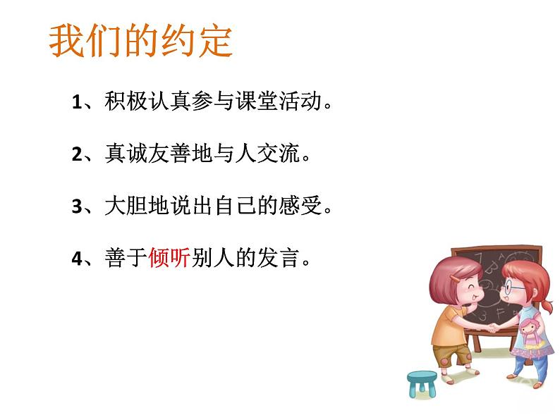 展开1、积极认真参与课堂活动。 2、真诚友善地与人交流。 3、大胆地说出自己的感受。 4、善于倾听别人的发言。