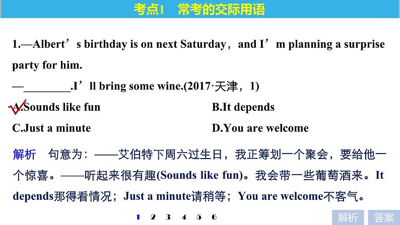 解析 句意为:——艾伯特下周六过生日,我正筹划一个聚会,要给他一个惊喜。——听起来很有趣(Sunds like fun)。我会带一些葡萄酒来。It depends那得看情况;Just a minute请稍等;Yu are welcme不客气。